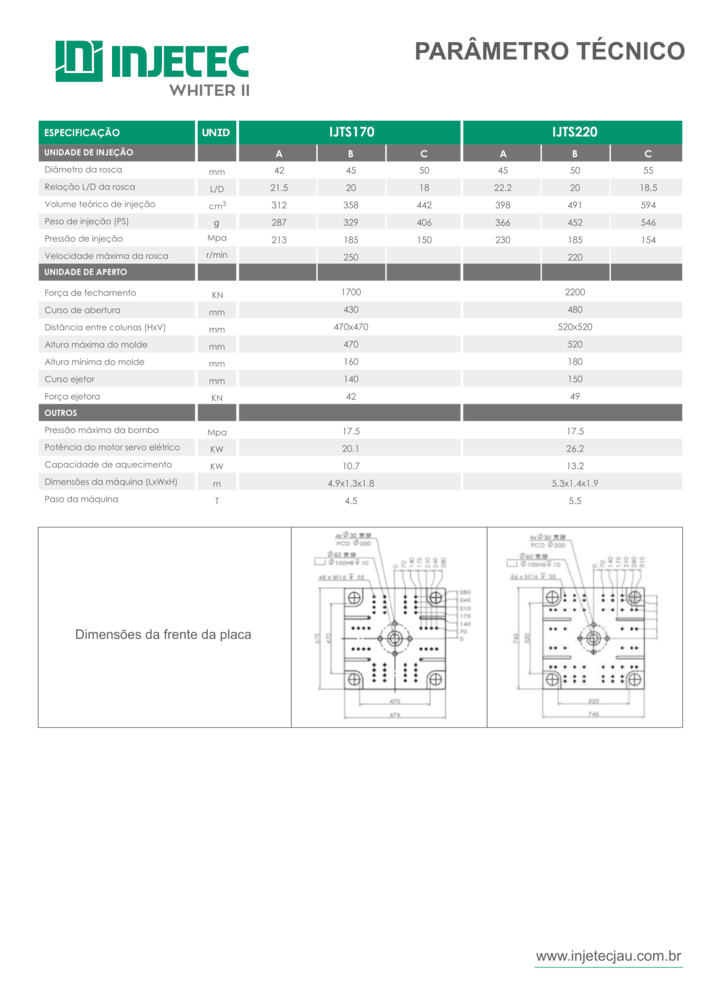 Peso de injeção: 287 g (PS) a 406 g (PS), dependendo do diâmetro da rosca